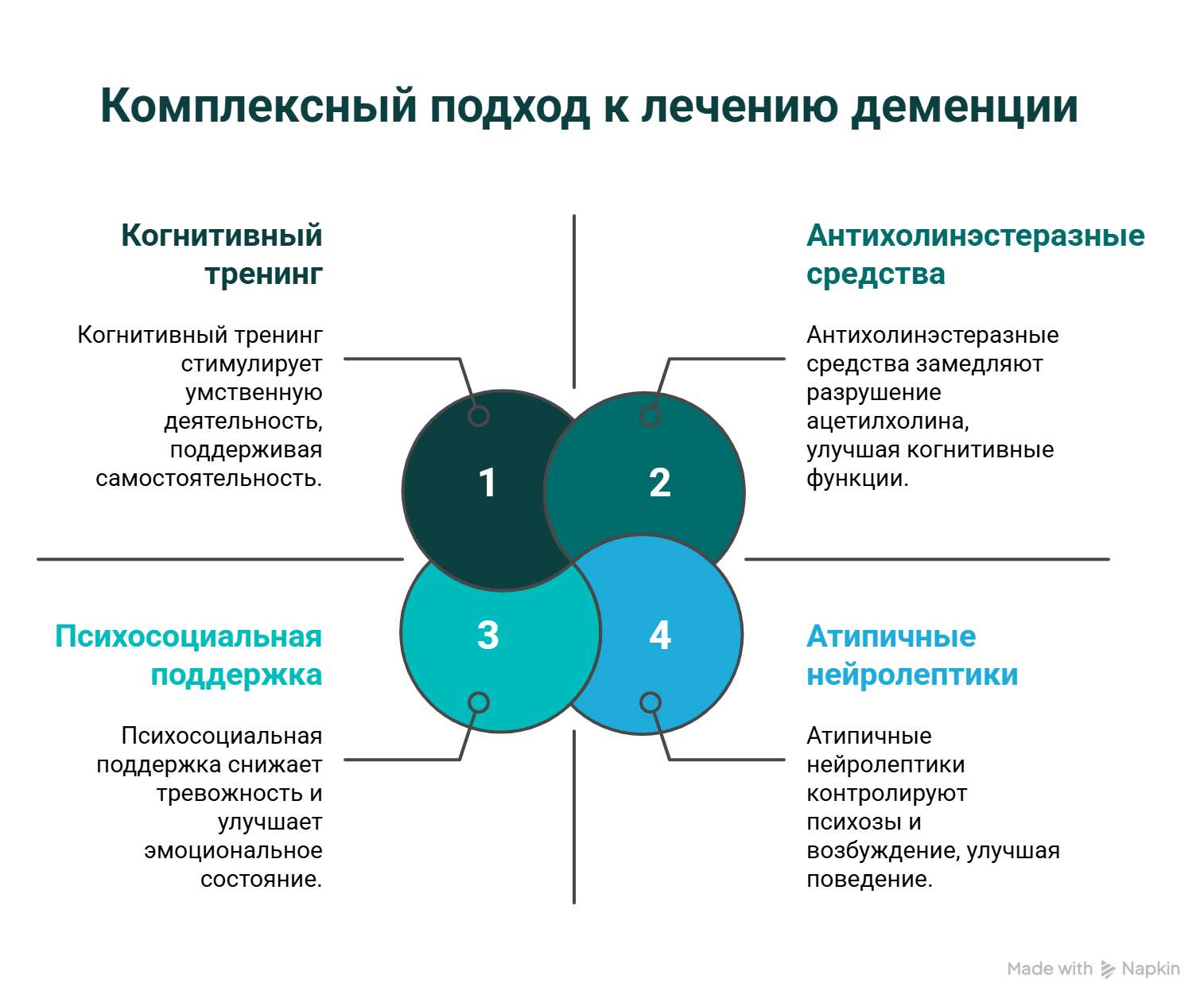 Комплексная терапия и когнитивная реабилитация: Лечение направлено на замедление деградации нейронов с помощью ингибиторов холинэстеразы и антагонистов NMDA-рецепторов. Важнейшим этапом является коррекция поведенческих расстройств (агрессии, нарушений сна) и создание «поддерживающей среды», которая замедляет социальную дезадаптацию пациента.